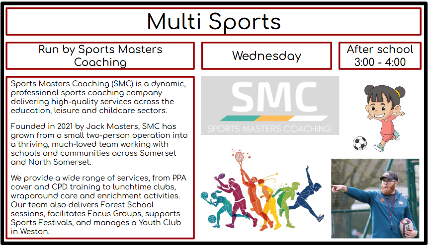 Please click on the images below, follow the link to the page to book directly with the providers. For the clubs that are school run, the link will direct you to Parent Pay where you are able to sign up and pay.