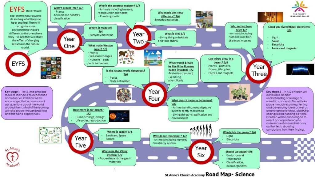 The road map demonstrates the science curriculum as it progresses through the school from Reception to Year 6.