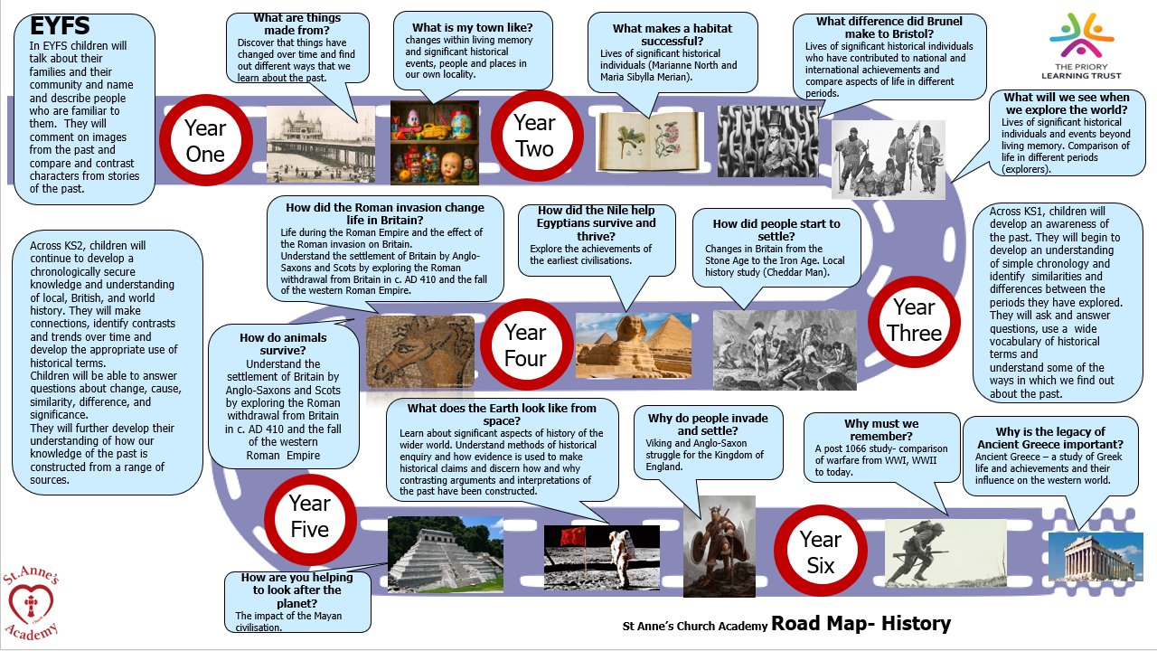 The road map below is to show the History curriculum as it progresses through the school from EYFS to Year 6.