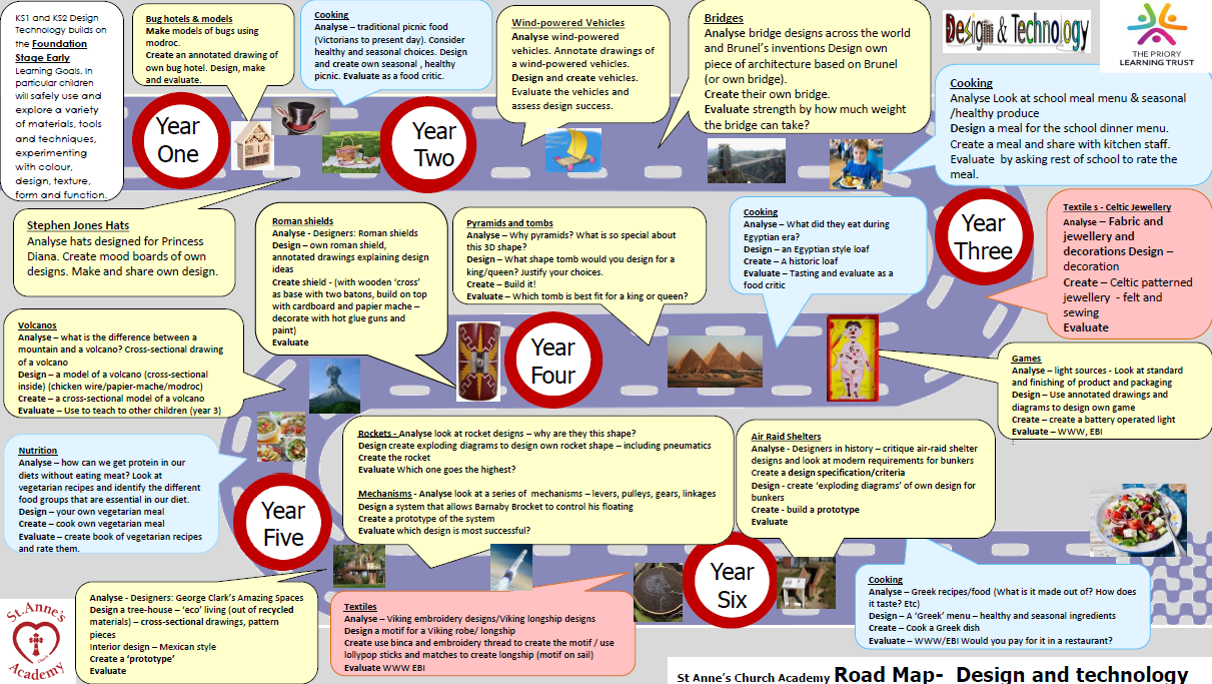 In KS1 children will give children opportunities to design products that are relevant to them (such as the home and school, gardens and playgrounds, the local community, industry and the wider environment). In KS2 children will be taught to analyse and create their own innovative and functional products for a range of relevant contexts (for example, the home, school, leisure, culture, enterprise, industry and the wider environment)